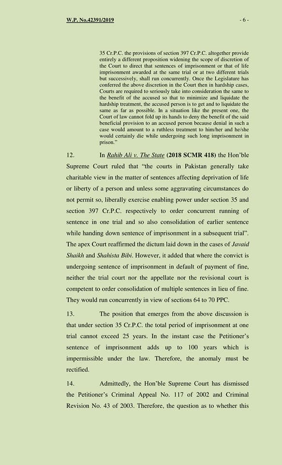 Under section 35 Cr.P.C. the total period of imprisonment at one trial cannot exceed 25 years. In the instant case the Petitioner’s sentence of imprisonment adds up to 100 years which is impermissible under the law. Therefore, the anomaly must be rectified.