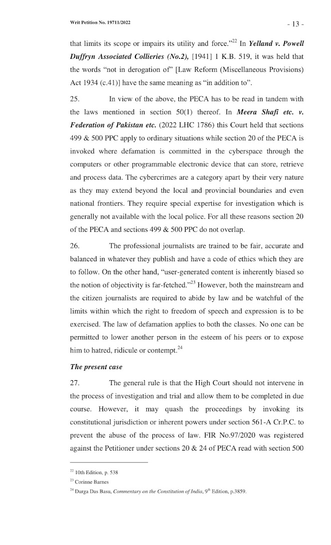 However, some authorities hold that the bar is not absolute. Every case has its own facts and the High Court can intervene in exceptional circumstances. 3The present case involves interpretation of Article 19 of the Constitution and statutory law which cannot be decided by the Magistrate and that too in an order on the application under section 249-A Cr.P.C. Besides, the Petitioner has challenged the very registration of FIR No.97/2020 and the jurisdiction of the FIA to investigate it, file report under section 173 Cr.P.C. and the competence of the Magistrate to take cognizance of the alleged offences. There is also the question as to whether there is abuse of the process of law against which the Petitioner is to be protected. Therefore, I hold that this petition is maintainable. The objection of the Superstore/Respondent No.2 is overruled.