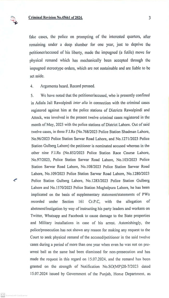 لاہور ہائیکورٹ نے تحریری فیصلے میں کہا ہے کہ بانی پی ٹی آئی کا جسمانی ریمانڈ کالعدم قرار دیا جاتا ہے، بانی پی ٹی آئی کی درخواستوں کو منظور کیا جاتا ہے۔