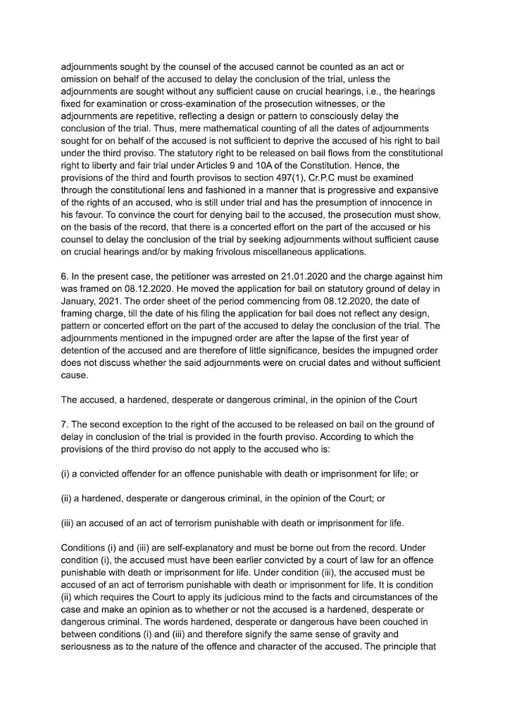 The second exception to the right of the accused to be released on bail on the ground of delay in conclusion of the trial was provided in the fourth proviso to section 497, Cr.P.C. According to which the provisions of the third proviso did not apply to the accused who was: (i) a convicted offender for an offence punishable with death or imprisonment for life; or (ii) a hardened, desperate or dangerous criminal, in the opinion of the Court; or (iii) an accused of an act of terrorism punishable with death or imprisonment for life.