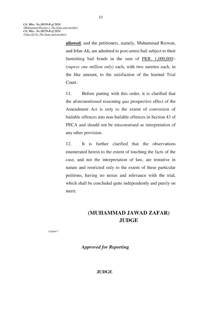 ترمیمی ایکٹ کے ذریعے پی ای سی اے کی دفعہ 43 میں کی گئی ترمیم جس کے تحت پی ای سی اے کی دفعہ 13 اور 14 کے تحت جرائم کو غیر ضمانتی جرائم میں تبدیل کردیا گیا ہے، نہ صرف طریقہ کار بلکہ بنیادی نوعیت کا ہے۔ لہٰذا اس کا اطلاق ممکنہ طور پر بھی ہوگا کیونکہ قابل ضمانت جرائم میں ضمانت دینا ایک ناقابل تنسیخ (بنیادی) حق ہے، یہ مطلق اور غیر مشروط ہے، جس سے اس پر کوئی اثر نہیں پڑے گا۔ اس کی وجہ یہ ہے کہ اگرچہ ضابطہ اخلاق کے تحت ضمانت مانگی جاتی ہے، لیکن اس کا تعلق ملزم کی آزادی اور نقل و حرکت سے ہے اور ترمیمی قانون پہلے سے قابل ضمانت جرم بنا کر اور اسے غیر ضمانتی میں تبدیل کرکے ملزم کے مذکورہ حقوق کو متاثر کرتا ہے، جس سے ملزم کا بنیادی حق متاثر ہوتا ہے، یعنی حق کے معاملے کے طور پر فوری طور پر رہا کیا جائے۔ اس مقصد کے لیے، جیسا کہ مذکورہ بالا معاملوں میں بیان کیا گیا ہے، یہ واضح ہے کہ اصل حق کو چھینا یا نقصان نہیں پہنچایا جا سکتا ہے اور ترمیمی قانون کا کوئی بھی سابقہ اطلاق ملزم کے ذاتی حق میں خلل ڈالے گا اور قانونی ناانصافی پیدا کرے گا، جس سے اسے فقہ کے طے شدہ اصولوں کے تحت جائز قرار نہیں دیا جا سکتا۔ اس طرح، ترمیمی ایکٹ، اس حد تک، صرف متوقع طور پر لاگو ہوگا. مندرجہ بالا الفاظ میں جواب دیا.